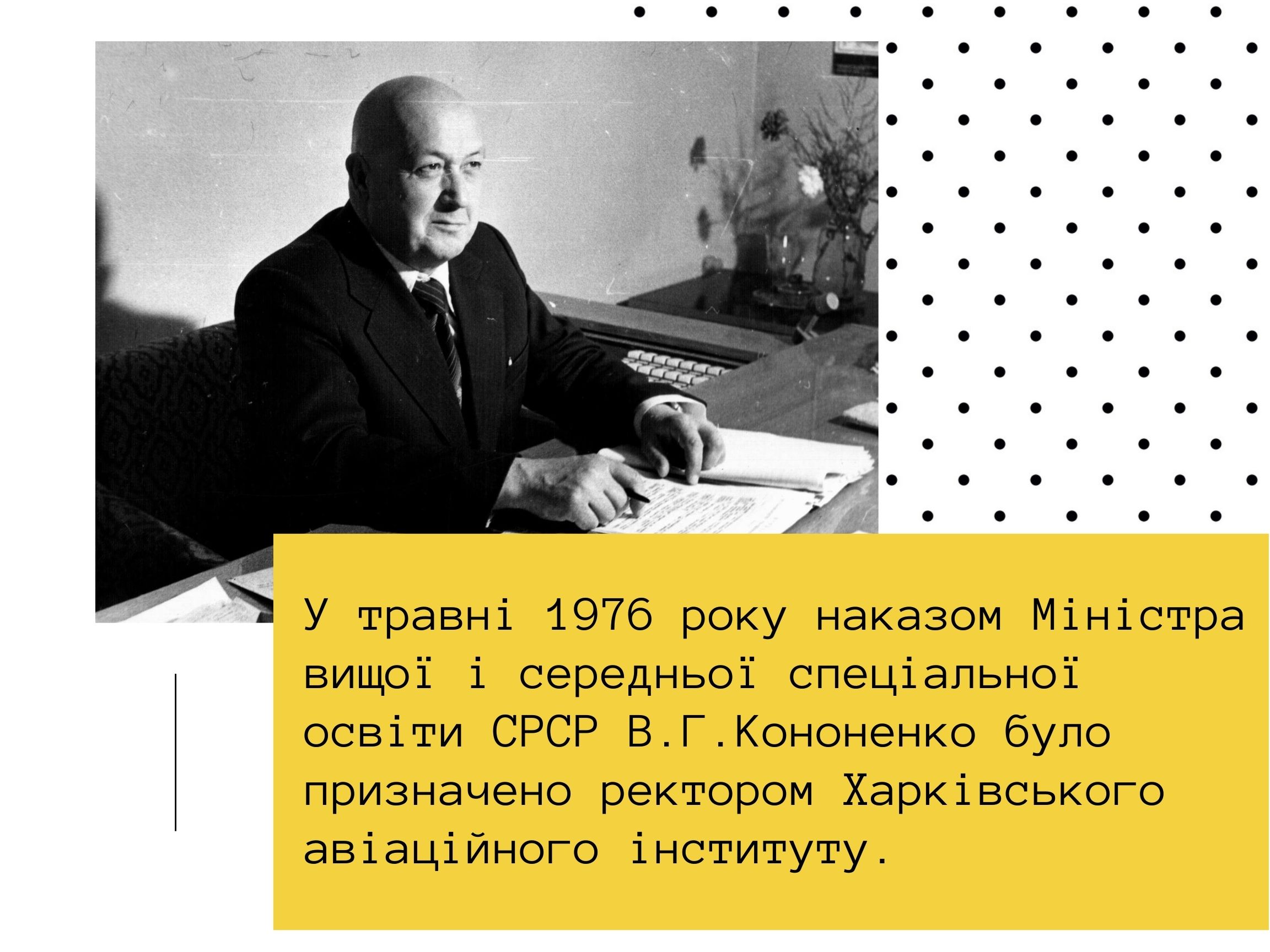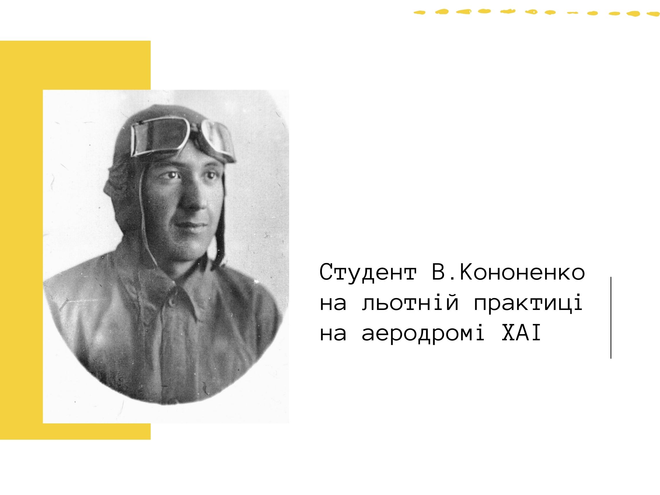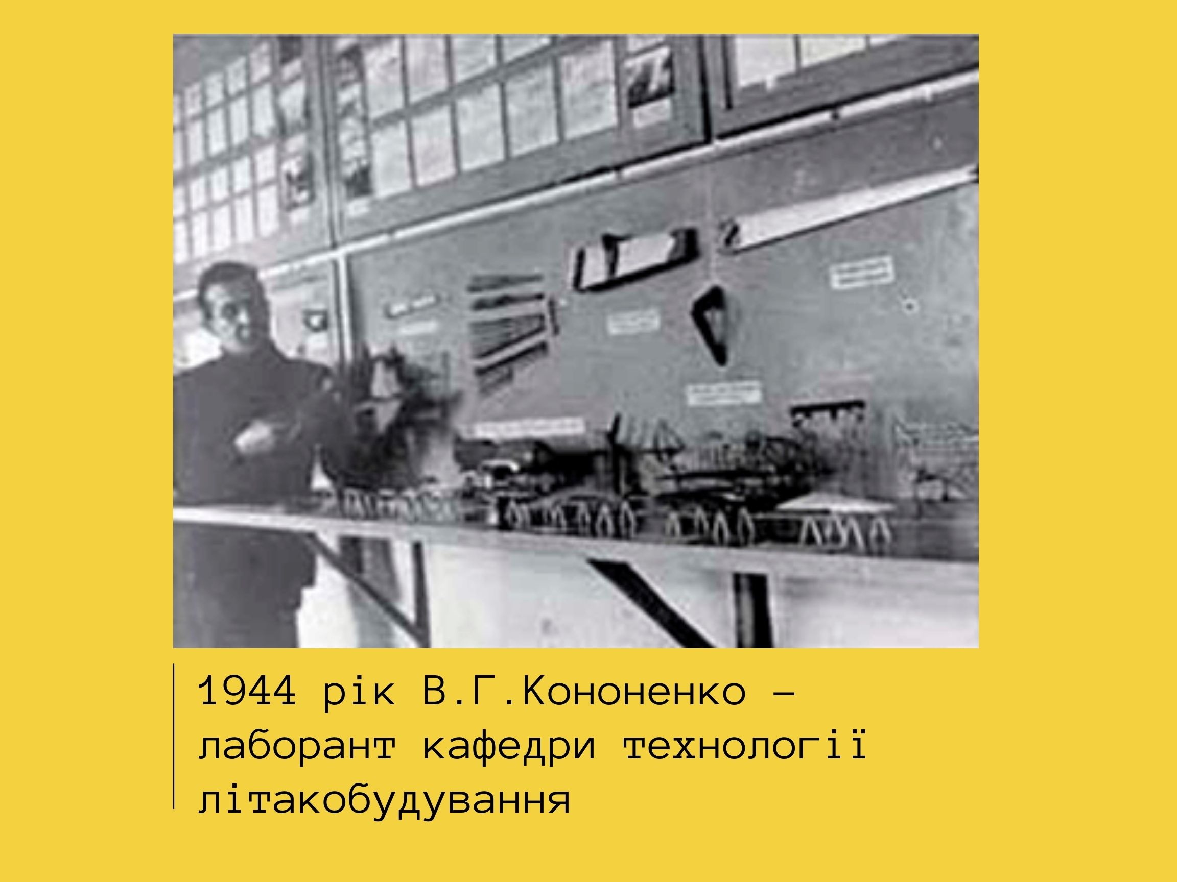 У 1944 році він з відзнакою закінчив інститут і комісією з персонального розподілу молодих спеціалістів його було направлено на кафедру технології літакобудування (нині кафедра технології виробництва літальних апаратів). Спочатку В. Г. Кононенко працював на кафедрі на посаді старшого лаборанта. З вересня 1945 року В. Г. Кононенко працював асистентом, в 1949 році був переведений на посаду старшого викладача кафедри.