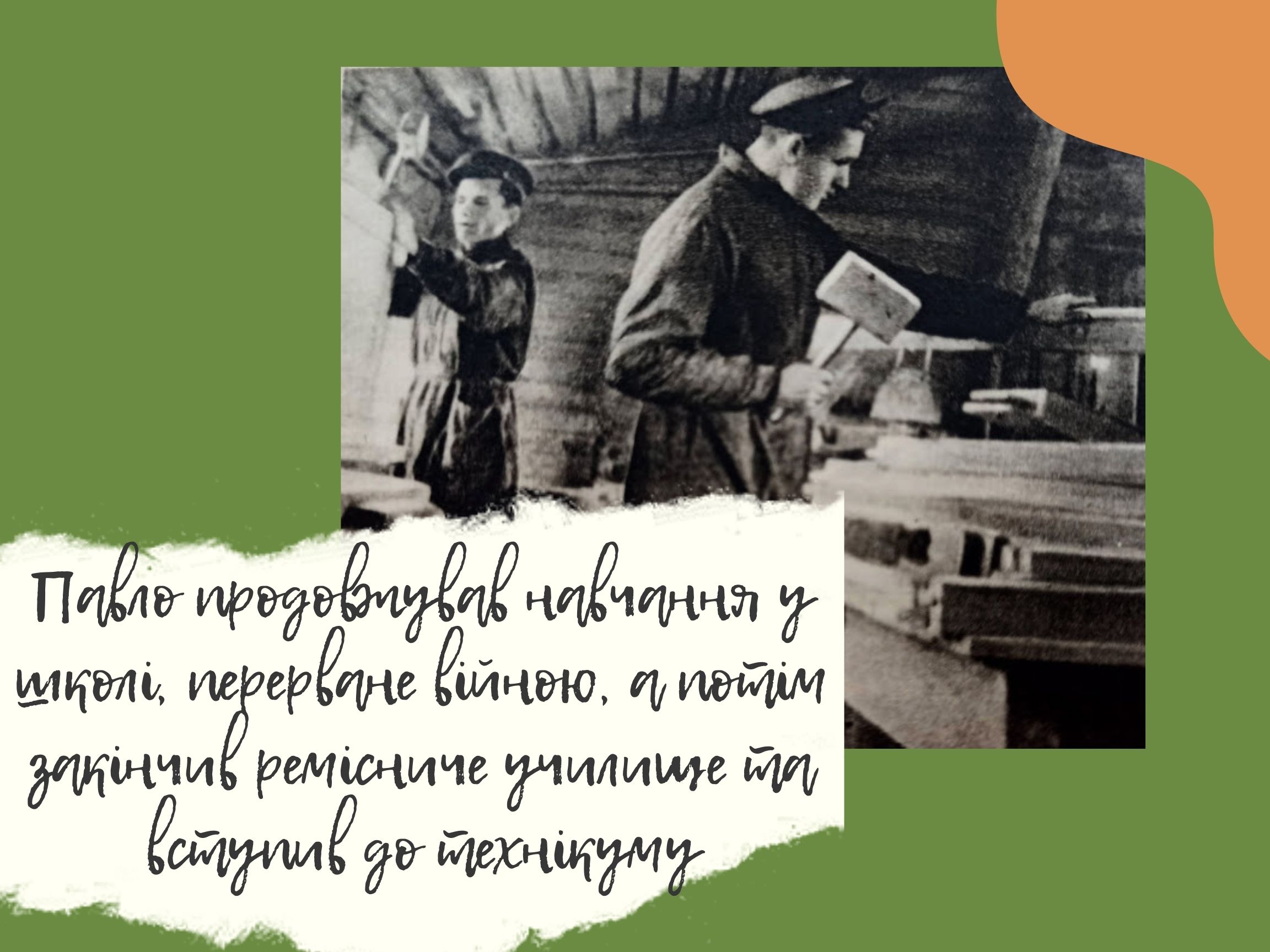 Незабаром і в сім’ю прийшло щастя: з Німеччини повернулася сестричка. Жилося їх сім’ї, як і іншим, не легко. Хліба мало, та й з одягом сутужно, тож Павло вирішив піти працювати вагарем на цукровий завод. Працював у нічну зміну, а в день ходив до школи. Дуже виснажувався. І тягнув доти, аж поки до Узина з Білої Церкви не приїхав його друг Олекса Компанієць. Він побачив виснаженого Павла і запропонував йому разом із ним поїхати до ремісничого училища, де той навчався. У кучерявій голові Олекси народжувались найдивовижніші ідеї. Павло погодився.