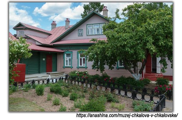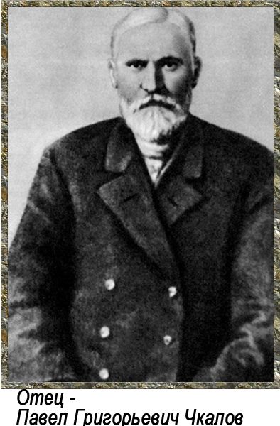 «… Передо мной старя фотография. Дом Чкаловых выглядит на ней аккуратным, не богатым, но добротным, крепко сколоченным.Ладный, крепкий, всегда чисто убранный чкаловский дом стоял на горе, над рекой, где издавна селились мастеровые, грузчики, бывшие бурлаки – словом, простой люд. В этом доме многое носило отпечаток характера отца Валерия Павловича – Павла Григорьевича, коренного волгаря, знаменитого на всю округу котельщика, славного мастера.