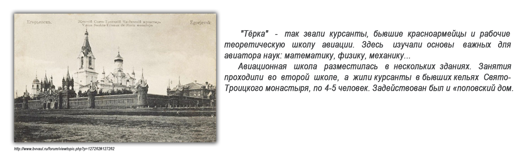 «…В то время в России была только одна начальная, точнее, подготовительная авиационная школа – в небольшом городке Егорьевске, под Москвой. Называлась она Теоретической школой авиации, и попасть туда было очень трудно.